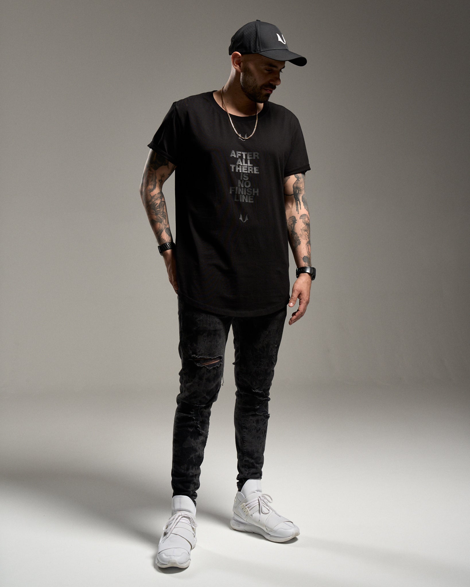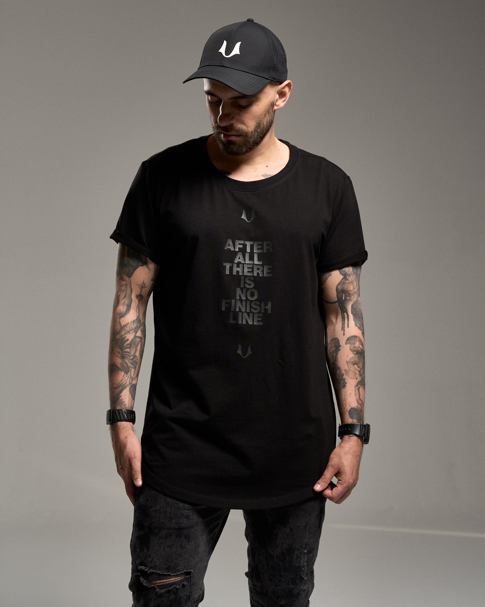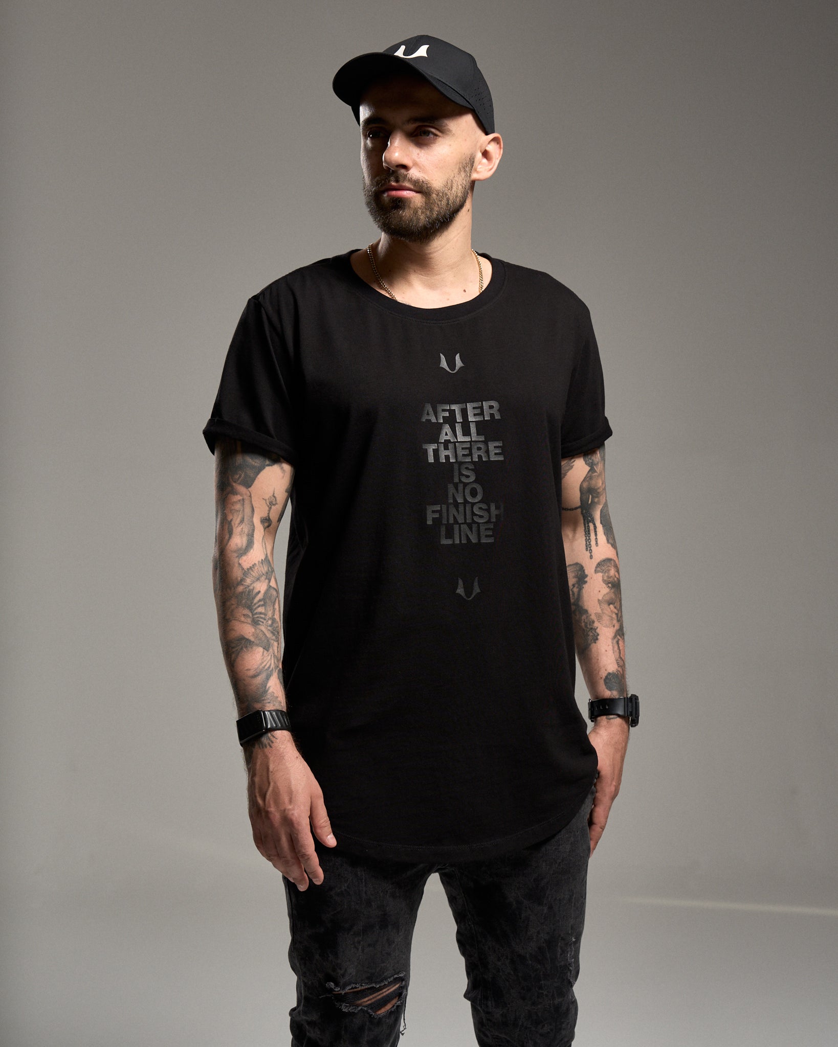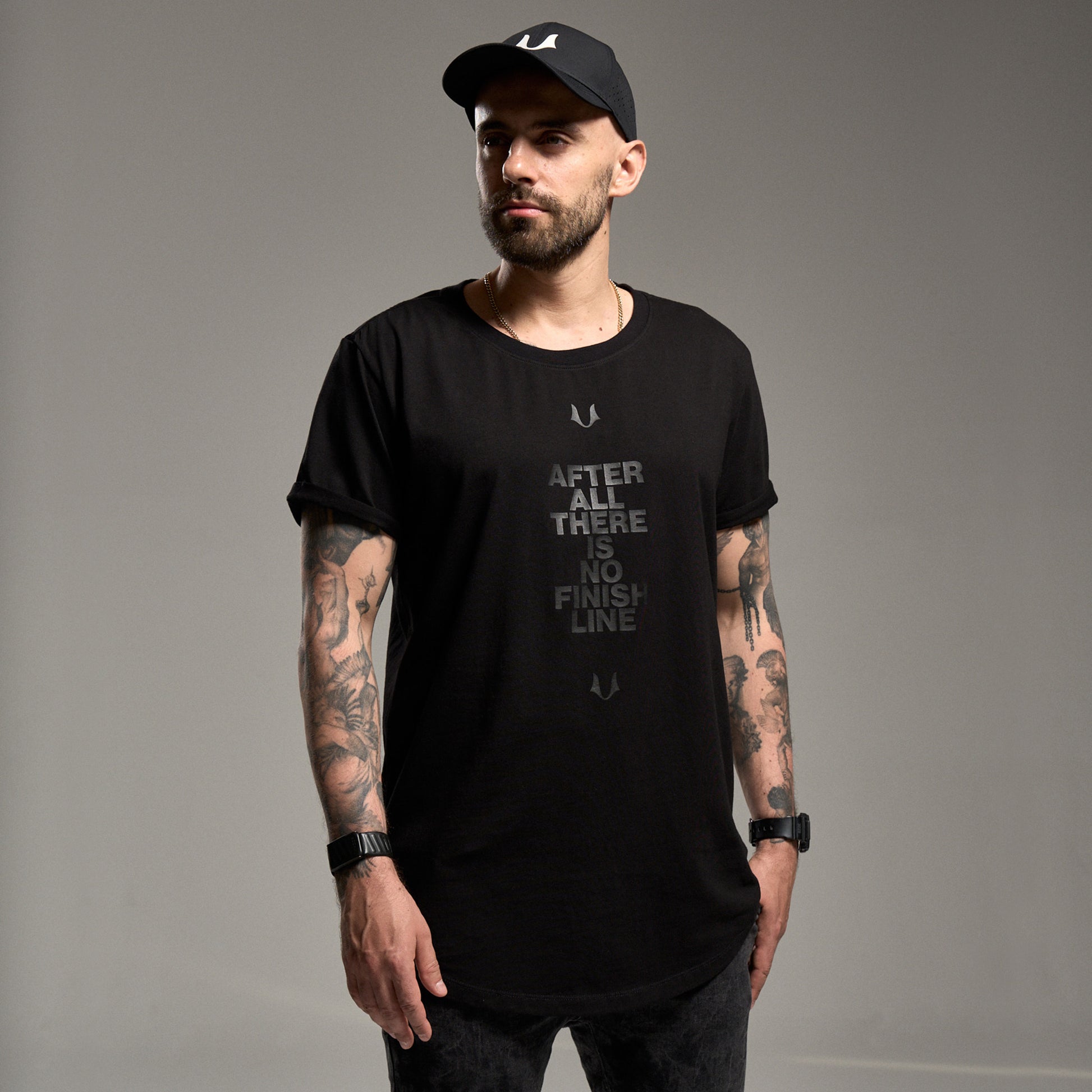 Klasyczny t-shirt. Chcieliśmy zrobić na nim szalony nadruk, ale lud zdecydował, że w dupie mają nasz wymyślny dizajn i chcą prostych rzeczy. Więc jest prosto: czarny nadruk na czarnej koszulce. W sam raz, by nie rzucał się w oczy za bardzo, a wciąż robił wrażenie. I żeby przypominał, że after all there is no finish line. Tak w razie, gdybyś chciał(a) odpuścić, czy coś.